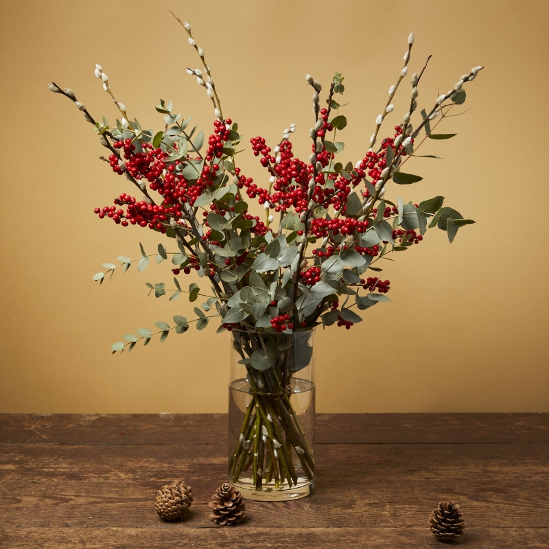 Festive arrangement with red berries, eucalyptus, and pussy willow, perfect for Christmas. Available for delivery in Clapham (SW4), Balham (SW12), across London and Surrey. Order now!