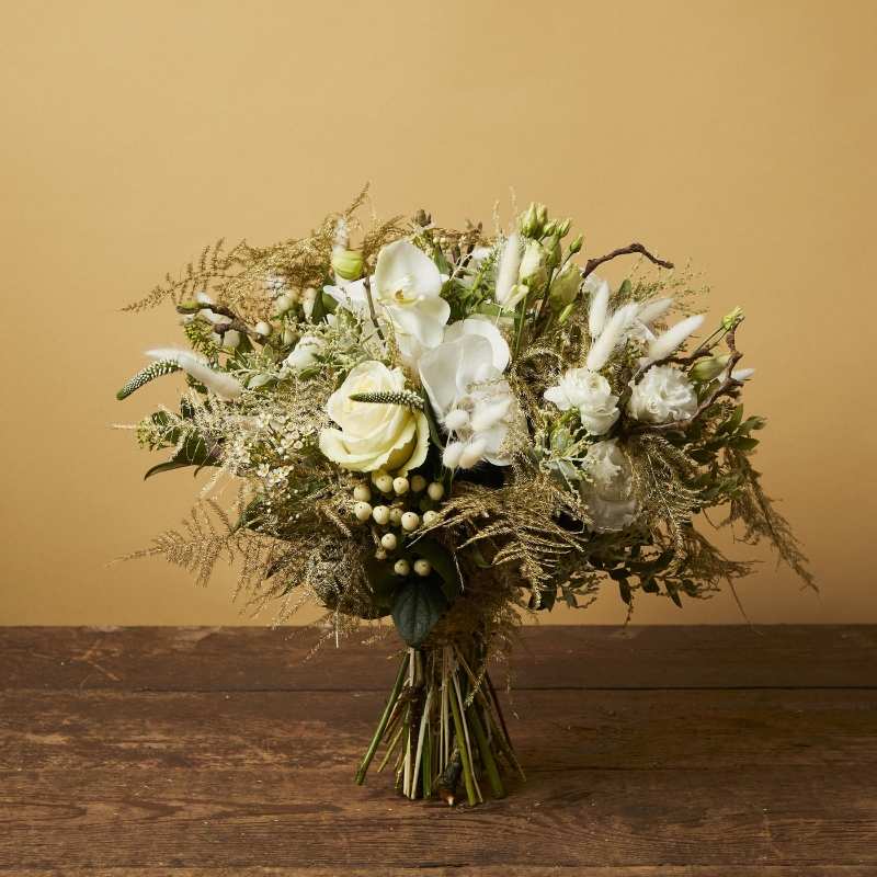 Elegant white Christmas bouquet with roses, lisianthus, and festive foliage. Available for delivery in Clapham (SW4), Balham (SW12), across London and Surrey.